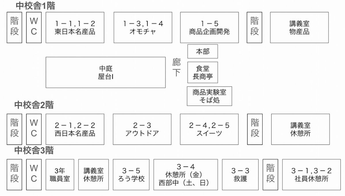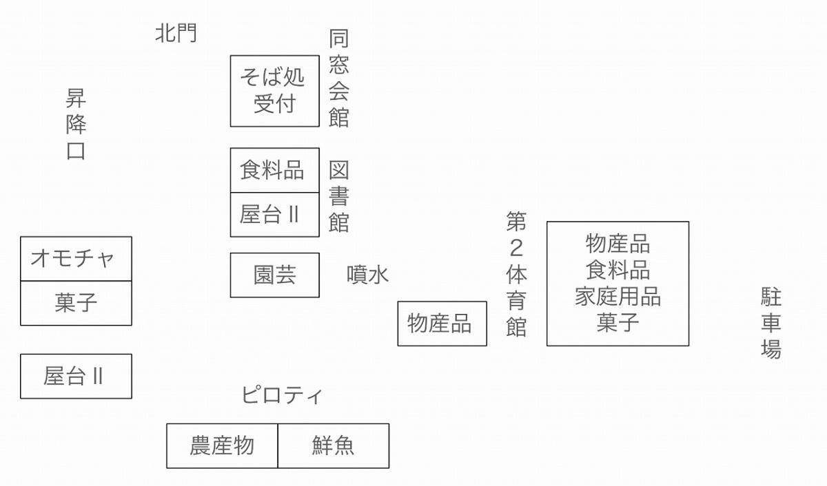 そ ば 処 → 同窓会館前で受付、商品実験室
